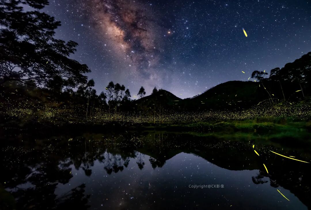 四个月内五次造访这个位于广东江门的湿地秘境,终于记录下了梦中的场景:成群的萤火虫在湖面上闪烁并留下清晰的倒影,璀璨的银河系中心从地平线缓慢升起,地球上的生命之光和宇宙中的星光融为一体,这就是梦幻的萤火之森啊!