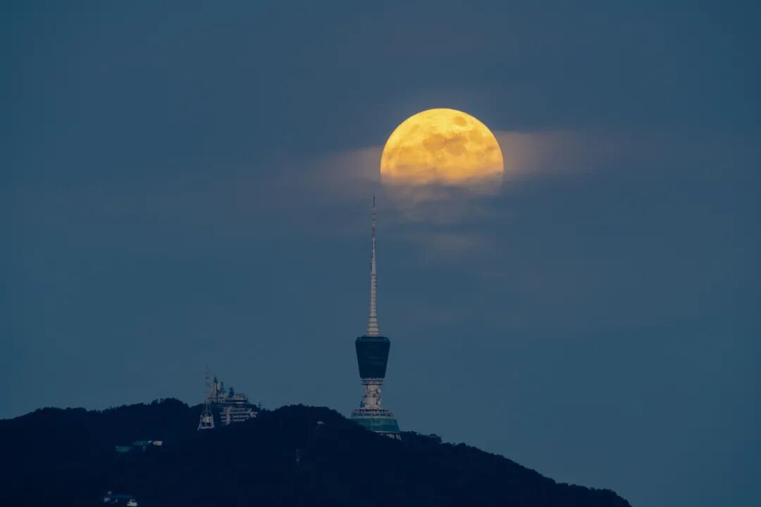 超级月亮光临深圳,穿过梧桐山电视塔,一点薄云增加了意境。