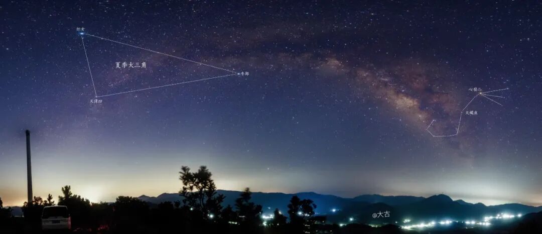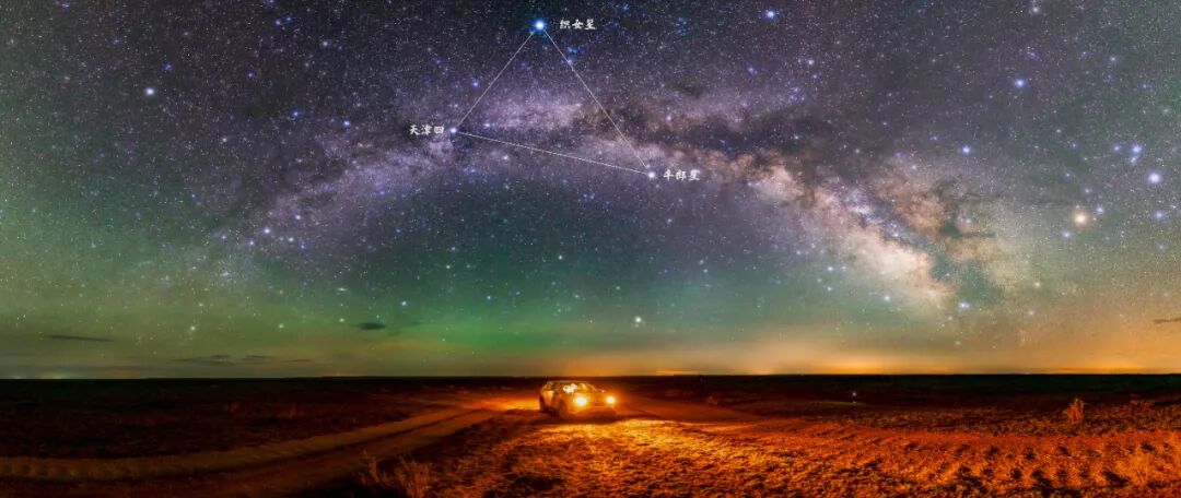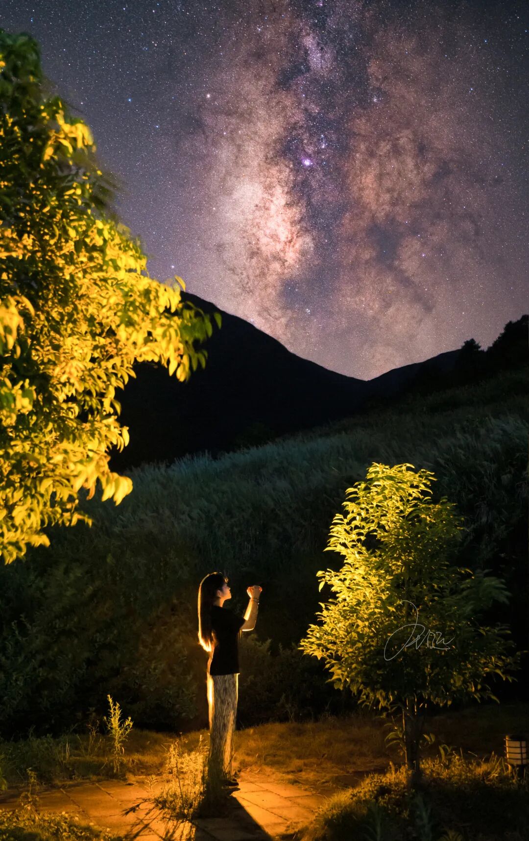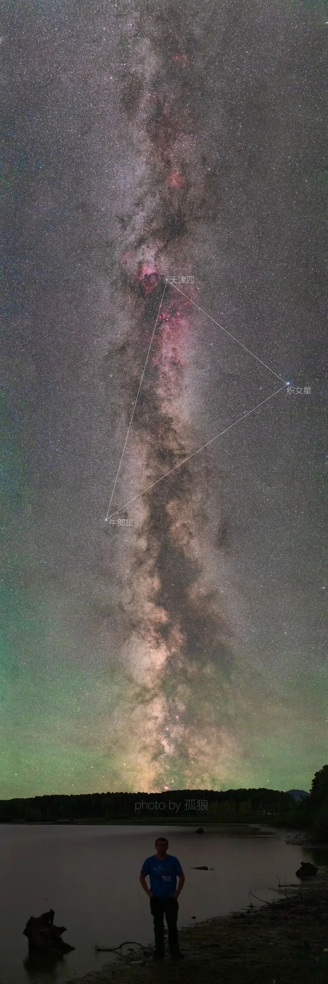 许久未仰望星空,夏季的银河依然璀璨。寂静的山前,人间的灯火如海闪烁奔流,抬头凝望,白色的银河、心宿、夏季大三角跃然在眼前。现代文明与古老恒远的星光,在这里碰撞交汇。天阶夜色凉如水,坐看牛郎织女星。给岁月以文明,每一个闪亮的星星,古人都赋予了一个个动人心弦的故事,在旷野寂静下,聆听那从古到今的声鸣。牛郎、织女,七夕之时,鹊桥之上,浪漫而凄美。愿夏夜灿烂,伴你入梦。
