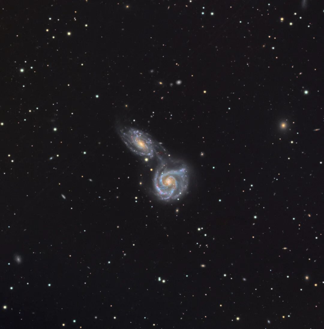 这是一对位于室女座的相互作用星系,编号ARP271,距离地球9000万光年,两个星系部分悬臂已经交融在一起,中心产生了大量的恒星,两者将在未来的数百万年内相撞,这是属于宇宙的浪漫,星系之间的“贴贴”。