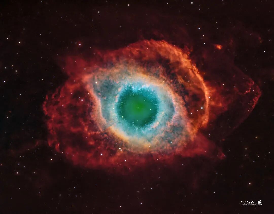 约700光年外,一颗类似太阳的恒星的死亡造就了这一片酷似一只眼睛的星云。这张图片用4种窄带滤镜展示了NGC7293的内部结构。氢元素为红色,硫元素为黄色,氧元素为蓝绿色,氦元素为绿色。