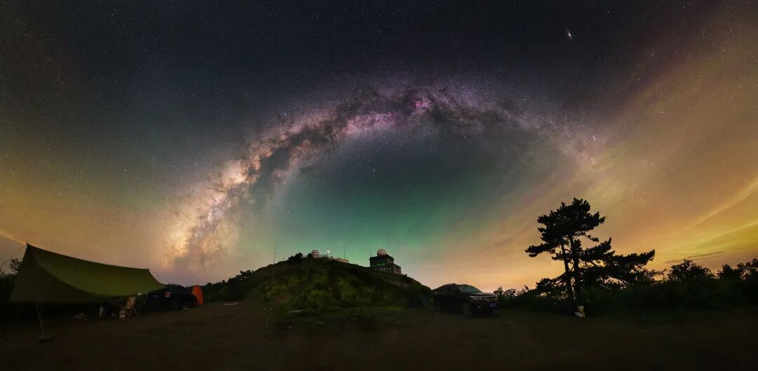 特地挑了个不是周末的日子来牵牛岗,露营的人不算太多。凌晨一点多,银河反拱高挂在气象雷达站上空,与橙绿色的气辉交相辉映。