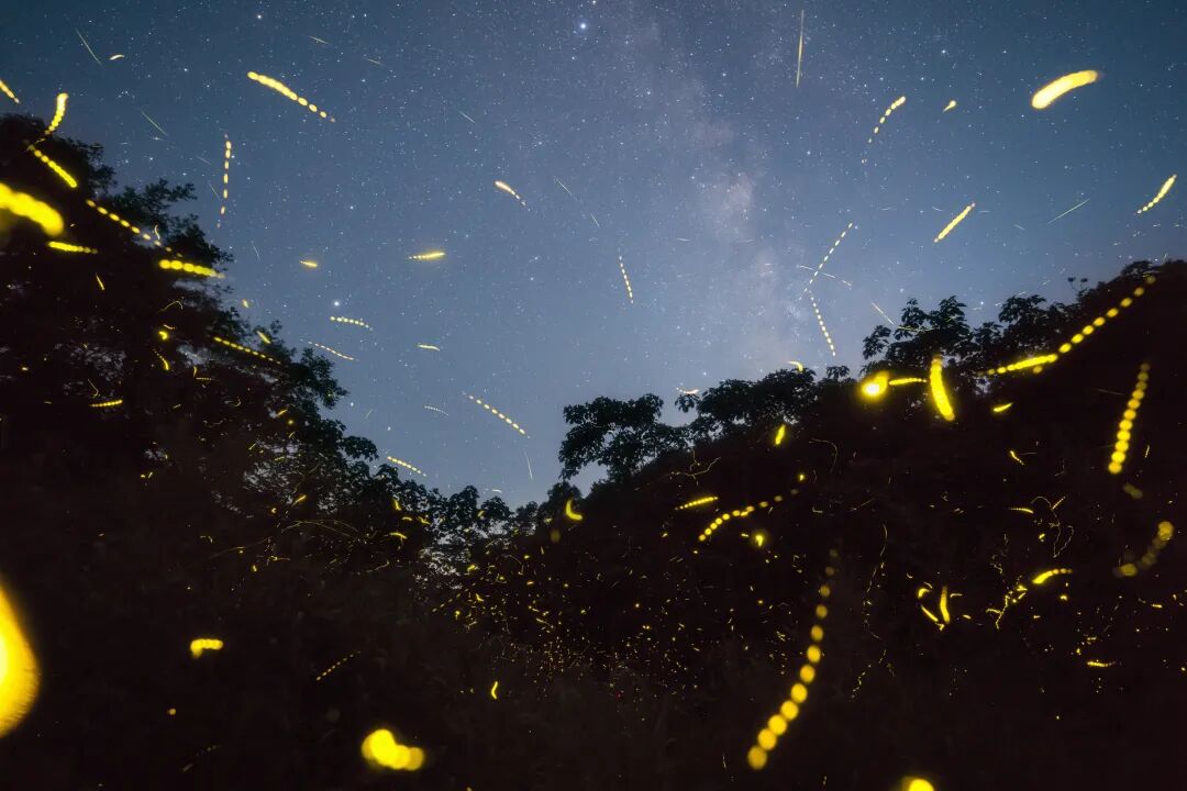 随着天色渐渐暗下来,萤火虫如小精灵一般,一只、两只、三只,星星点点地出现了。伴着蝉声、虫鸣,繁星也不失时机地洒满了天空。“纤云捲尽星河淡,疏萤乍飞幽径。”此刻,天河高挂,精灵闪烁,来自遥远宇宙的星光和近在咫尺的萤光交织共舞,相映生辉。感恩大自然的馈赠,这份独属于夏夜的宁静与美妙!