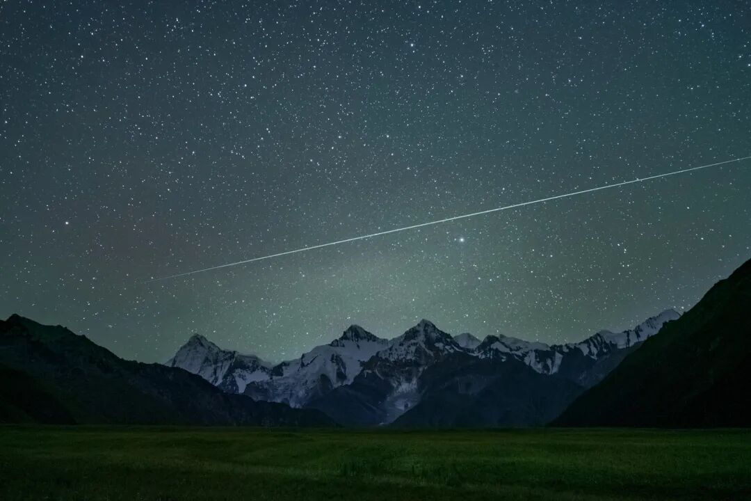 夏塔位于中国和吉尔吉斯斯坦交界的地方,夏塔峡谷又称唐僧古道,是丝绸之路上最为险峻的一条通道。沿着古道草原前行便是木扎尔特雪峰群,远望其间有五座冰山就像一朵雪莲花非常的壮观美丽!夜间璀璨的星辰与终年不化的冰雪山顶交相辉映熠熠生光,一颗超长的火流星从雪峰群顶划过,没入寂静的山谷,仿佛回应着古老的呼唤!