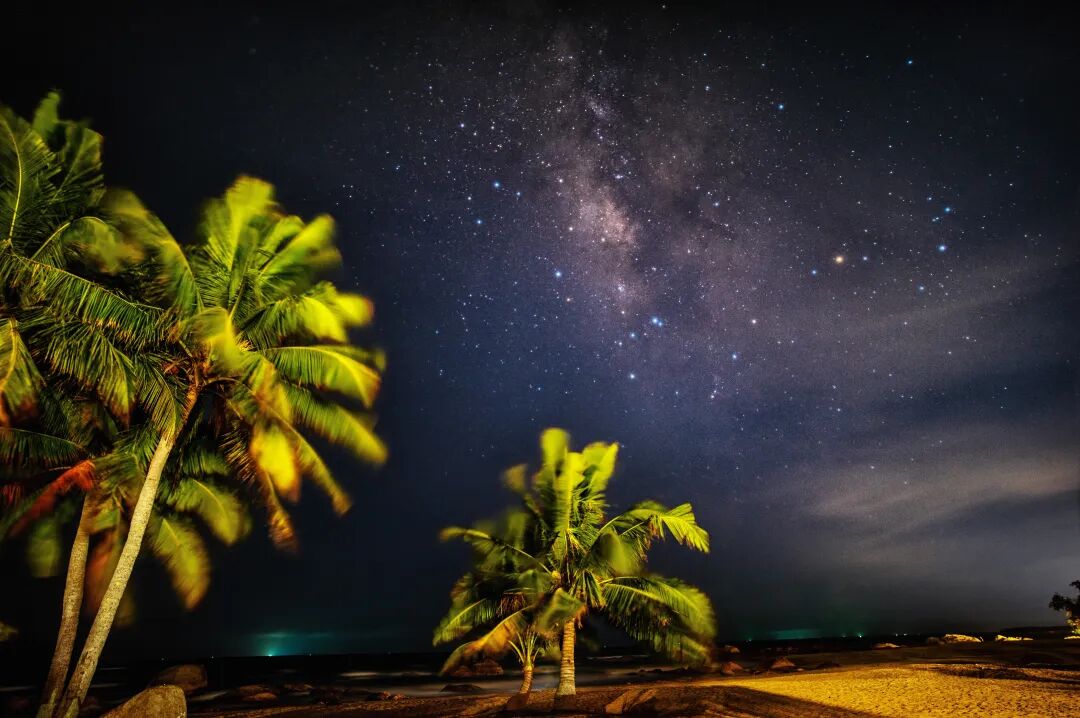 淇水湾海滩的北边光污染严重,即使这样,也可以目视到银河,晚上的淇水湾没有白天的喧闹,海风吹动着椰林沙沙作响,伴随着远处的海浪和天上的银河,形成了一幅南国独有的星空画卷。