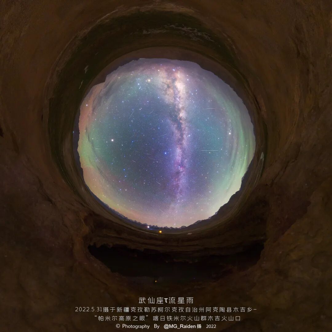所以,面对这次武仙座τ流星雨可能出现的流星雨爆发,我们追逐晴天,长途奔袭上千公里从新疆伊犁(北疆)来到了新疆克州阿克陶县的“帕米尔之眼”木吉火山口(南疆)。经过一整晚5台相机的拍摄,全天一共抓取到24颗武仙座τ群内流星,终于记录下了这一难得的景象。