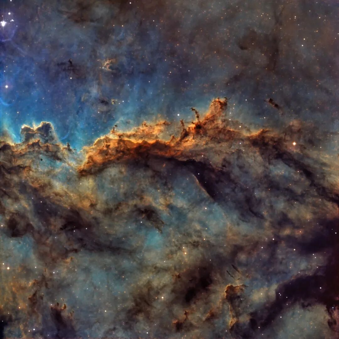 NGC6188位于天坛座内一个庞大分子云的边缘,离我们约4,000光年远。这些长约数十光年、镶着银边的暗云气,漂流在满是尘埃的天坛座内。星云内,数百万年前形成的大质量年轻恒星发出的强烈紫外辐射和恒星风,不断雕塑着这些奇形怪状的云气,也激发云气散发辉光。