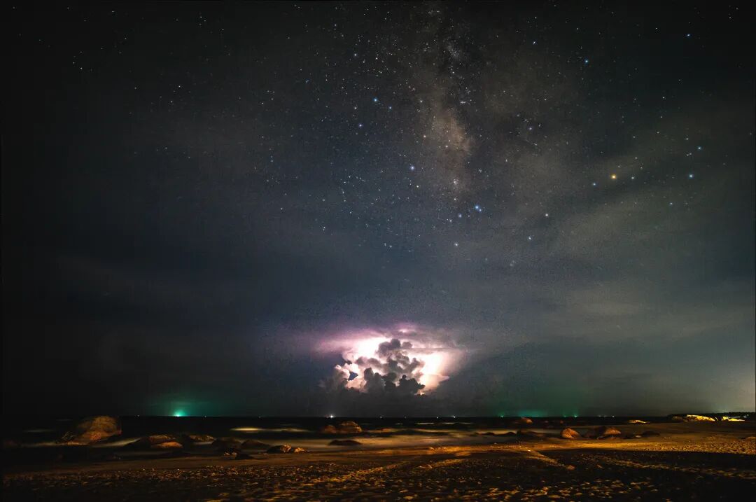 脚踩沙滩,面朝大海,头顶银河,不远处的天空,不断的出现闪电。我赶紧停止之前的拍摄,记录下这难得的画面。以往看到别人拍到的场景,今天居然也能亲眼见证,内心激动,又感慨大自然的神奇。