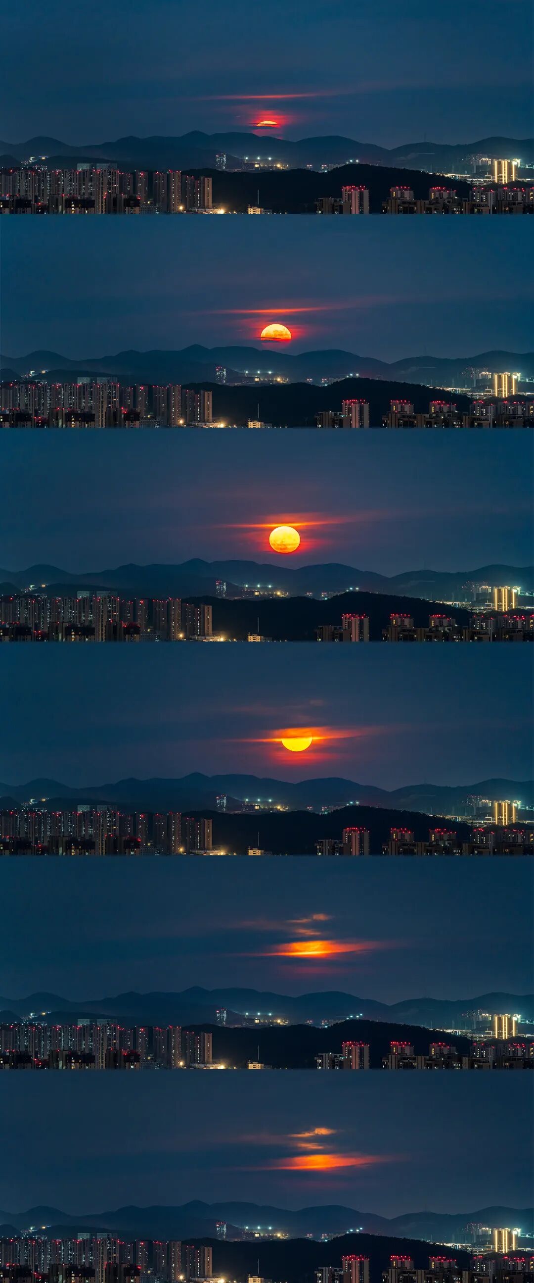 南京属丘陵地貌,东南方向宁镇山脉的余脉也为低矮的山丘,故理论上只要站在高处,便有机会看到远处山峰上的刚从地平线上升起的月亮。当天满月(中元节),白天最高温度接近40度,我背着器材爬上幕府山顶,拍下了一轮红月从连绵群山上升起的一刻。