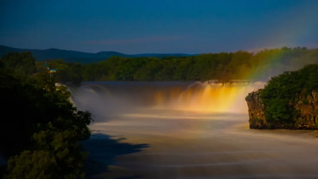 几十年一遇的大水,让丰水期的镜泊湖吊水楼瀑布愈加壮观,水流湍急,道路阻断,冒险蹚水到达镜泊湖瀑布前面的观瀑亭,立即被眼前的一幕震撼到了。正值满月,暴雨过后,天空格外通透,大瀑布上七彩虹清晰可见,美得让人窒息,无法言语。二话不说,拿起相机,记录下了这个难得一见的场景。