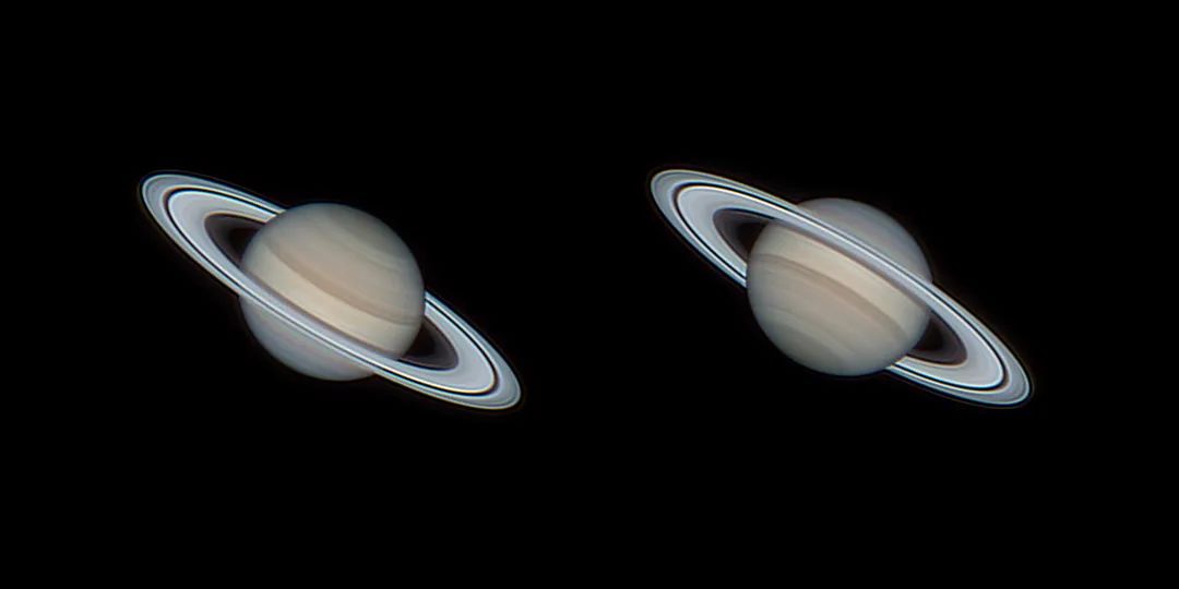 土星冲日那天没赶上好天气,冲日2天后查预报显示晚上有4小时晴天窗口期,果断约起,当晚高空视宁度非常好,低空有一点扰动,但是影响不大。拍摄采用RGB分别拍摄一分钟视频为一组,共计拍摄了8组,再通过后期视频叠加合成为一张照片。这次的土星处理的相对柔和一点,不再一味追求本体条纹的反差,感觉这样看起来更自然一点。冲日才过了2天,已经可以在左侧本体和环之间看到一点阴影。
