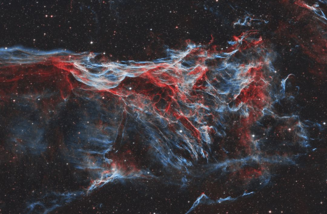 这片由震荡、发光的气体组成的外观混乱的纤维状星云位于天鹅座,是面纱星云的一部分。面纱星云本身是一个巨大的超新星遗迹,是一个7500年前的大质量恒星死亡爆炸后产生的膨胀云。云气范围非常大,约是五个满月的面积,展现了超新星爆炸消亡的壮丽。
