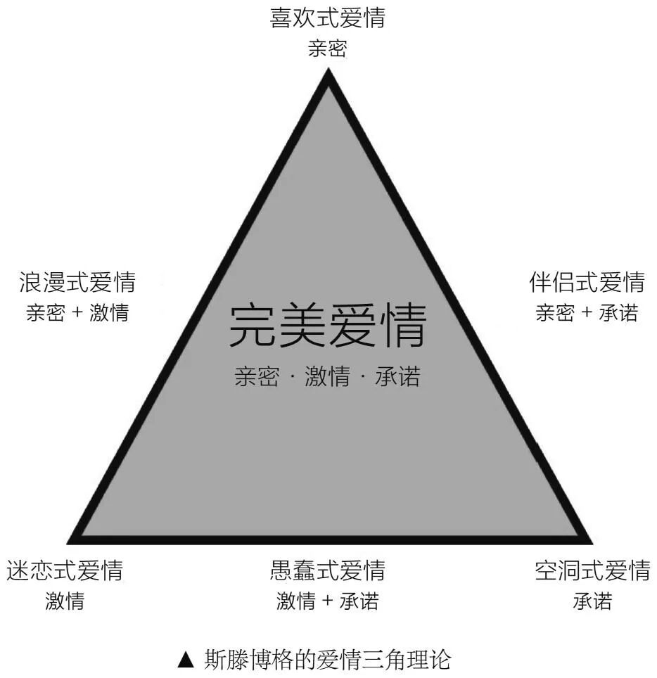 美国心理学家斯腾伯格提出的爱情理论,认为爱情由三个基本成分组成:激情、亲密和承诺。