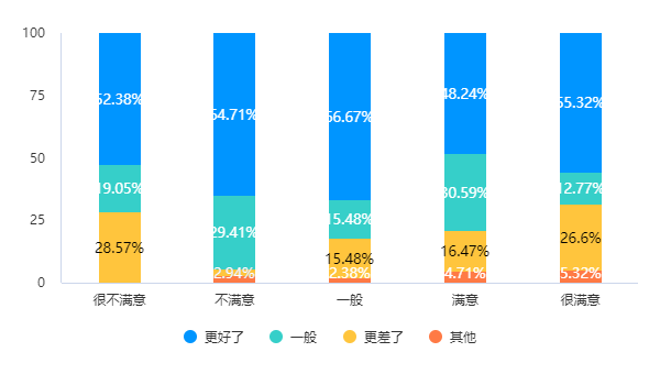 我们发现,对自己的评价较为绝对(即很满意与很不满意)时,对现状的不满程度更为强烈。