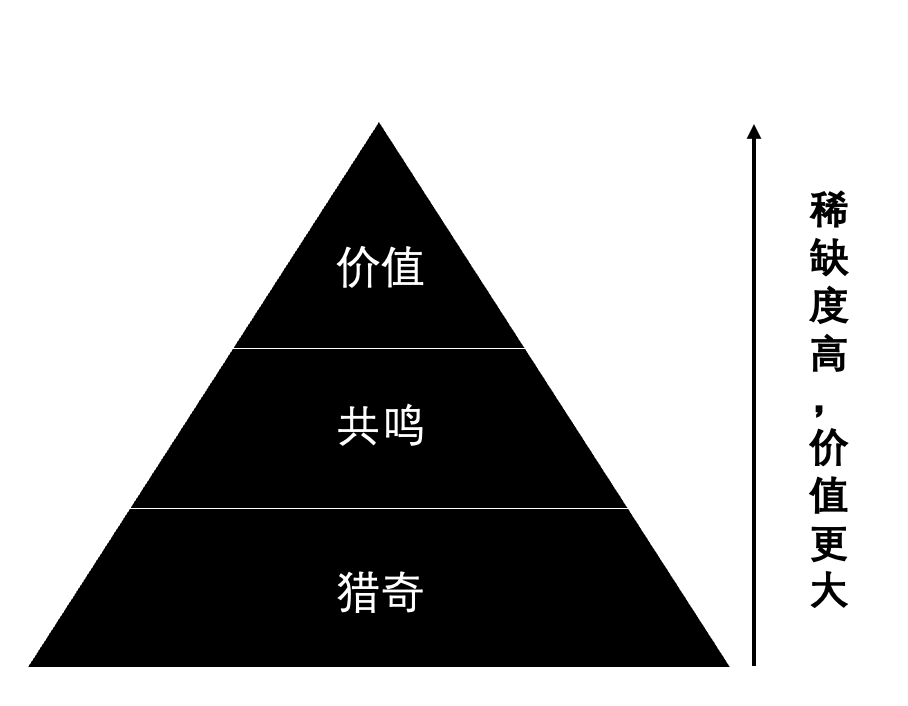 大家有没有发现,上述这三类内容与人类从本能到具有情感,再到创造价值的进化方向是一致的,这也代表了这三类故事从下往上,越来越高级,门槛越来越高、稀缺度也越来越高、同样价值也就越来愈高(这个观点也与丹尼尔·卡尼曼的《思考,快与慢》不谋而合,推荐大家阅读)。