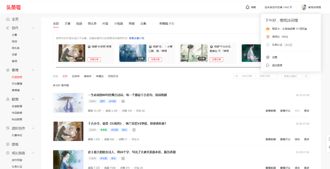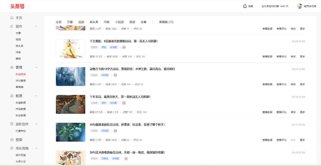 5、以下是我原创的一些凭证(放在本篇文章末尾),2023年10月19日在今日头条的推文记录,以及公众号南荒诗词馆、南陆书斋去年发布但删除的记录(为何删除重发,是我添加了第九首诗词,而且为了能在南陆书斋标记原创才把南荒诗词馆的文章删除);