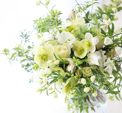 清新自然风花束的花材布局常常是松散而自由的,仿佛是随意采摘的花朵和植物束在一起。花束中的花朵和植物自然垂坠,营造出轻松、自由的氛围。