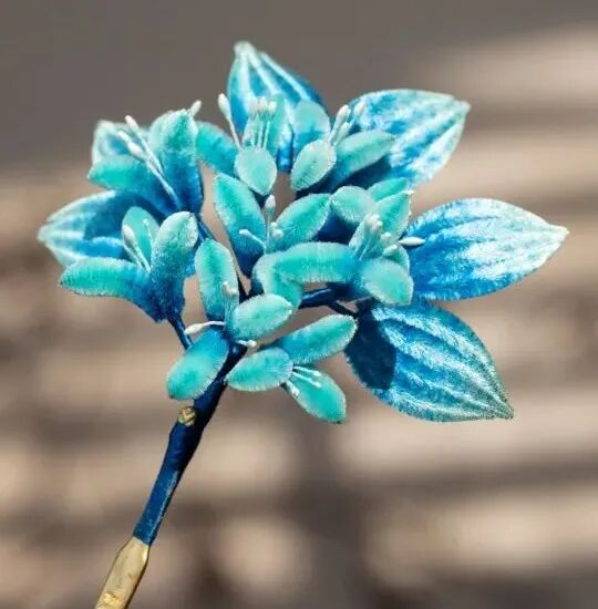 绒花的制作技艺非常精湛,需要经过多道工序。首先,优质生蚕丝需要经过煮制、染色、砰松晾干等工序,然后根据作品要求选择所需颜色的蚕丝进行披丝。披丝的过程需要精细的技巧和力度,确保蚕丝排列整齐、均匀。在披好丝之后,需要进行拴拍、剪撮、刀绒、刹形、熨烫等工序,最终制作成形态各异的绒花作品。