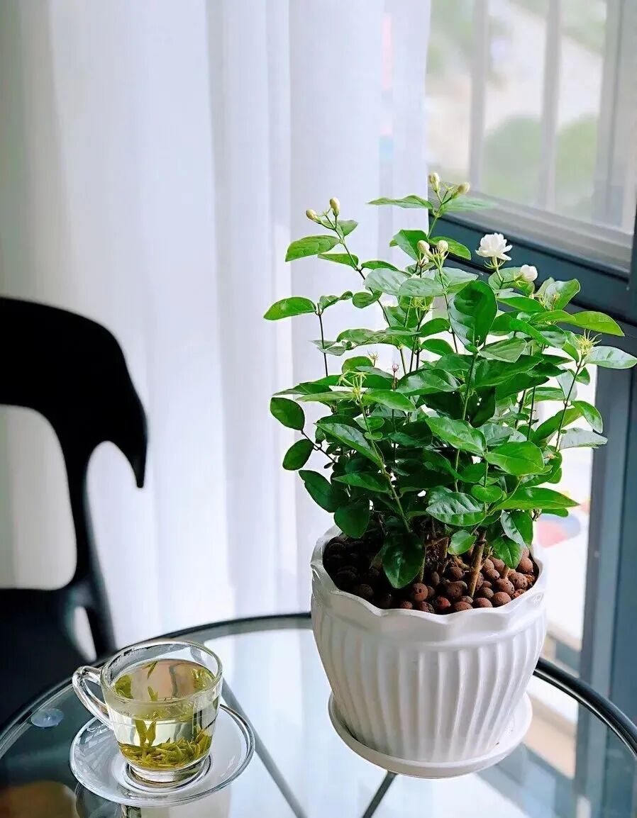 茉莉又名茉莉花,为木樨科素馨属(Jasminum)常绿灌木或藤本植物的统称,原产于印度、巴基斯坦,中国早已引种,并广泛地种植。茉莉喜温暖湿润和阳光充足环境,其叶色翠绿,花色洁白,香气浓郁,是最常见的芳香性盆栽花木。