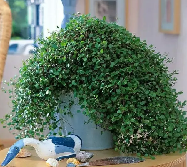 千叶吊兰是多年生常绿藤本植物。植株匍匐丛生或呈悬垂状生长,红褐色的茎十分细长。叶子小巧互生,叶片呈现心形或圆形。千叶吊兰株形饱满,枝叶婆娑,具有较高的观赏价值,适合作吊盆栽种或放在高处,长得茂盛的话,叶子数都数不清,所以有千叶吊兰之称。
