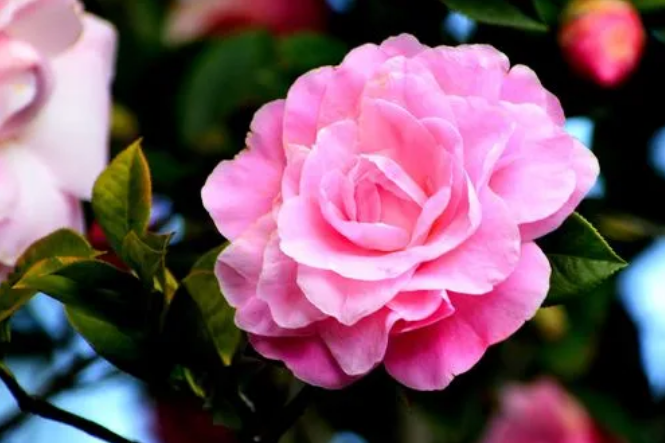 茶花,中国的十大名花之一,山茶花的花语:理想的爱、谦让。山茶花总是在晚秋天气稍凉时,静静地开在庭院之中。山茶花凋谢时,不是整个花朵掉落下来,而是花瓣一片片地慢慢凋谢,直到生命结束。