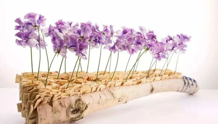 荷兰乃至世界的顶级花艺大师,擅长将自然元素与传统元素的融合设计,保持花材本身的特点和优势,利用技巧来创新,他的作品喜欢用竹片,木片等木质材质与花材结合创作,造型多变,富含花朵、植物、情感、美丽和体验。他的有些作品在我看来很独特,有一种诡异的美,好几次看着看着就起了鸡皮疙瘩哈哈。