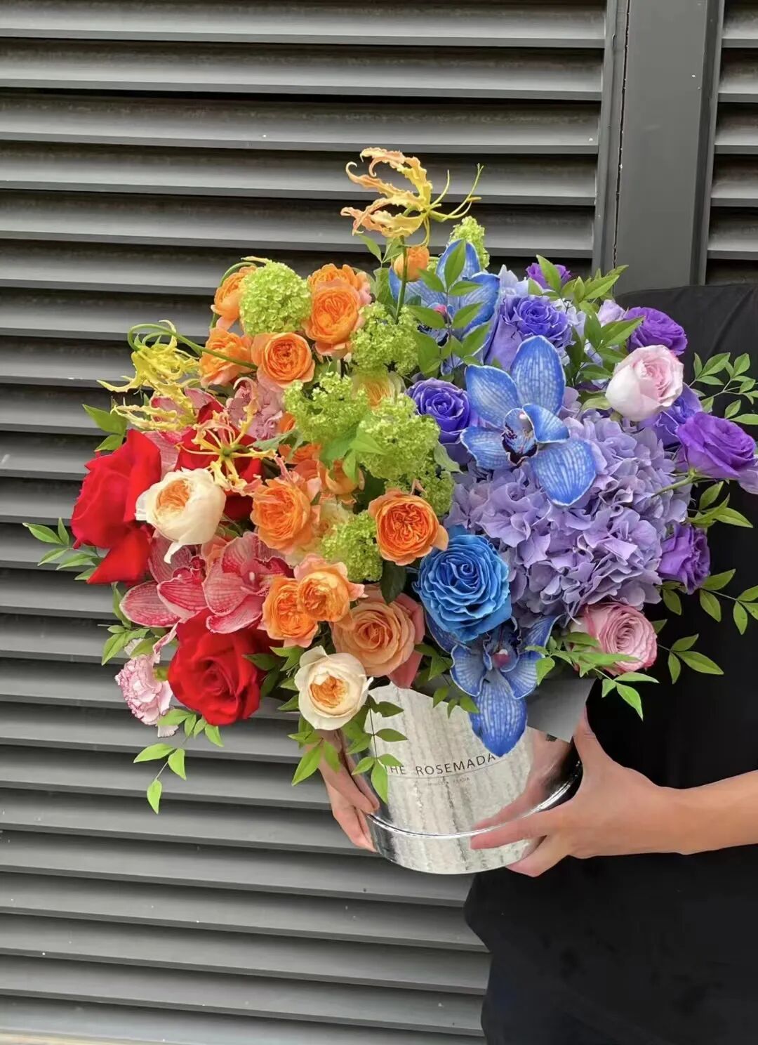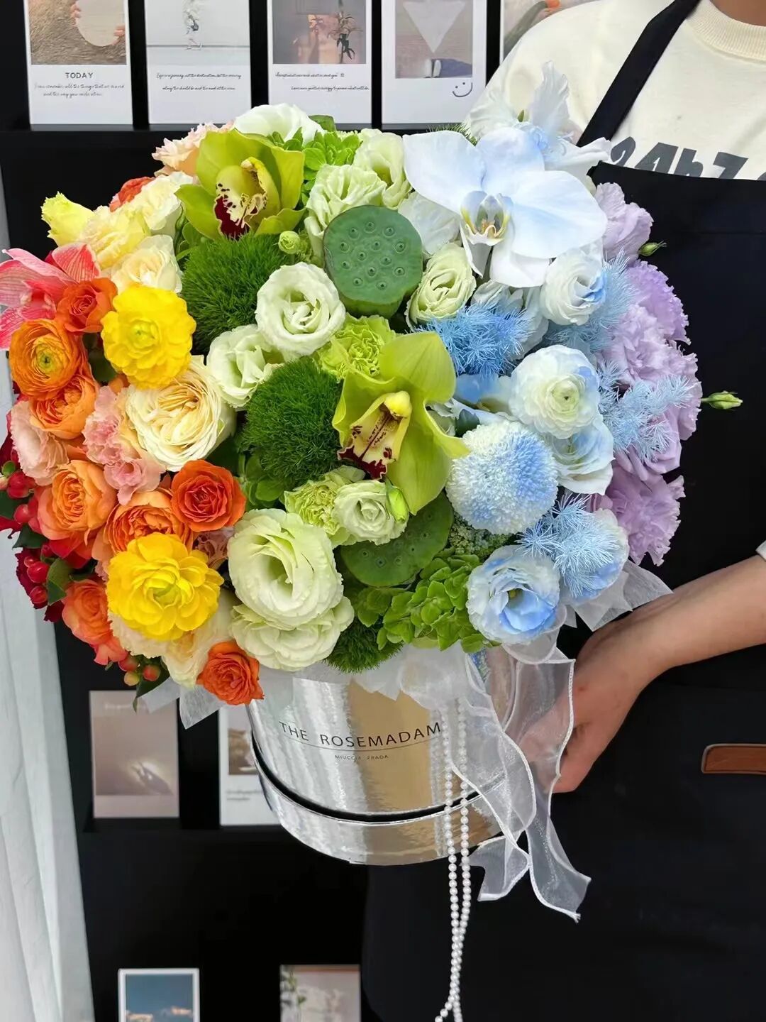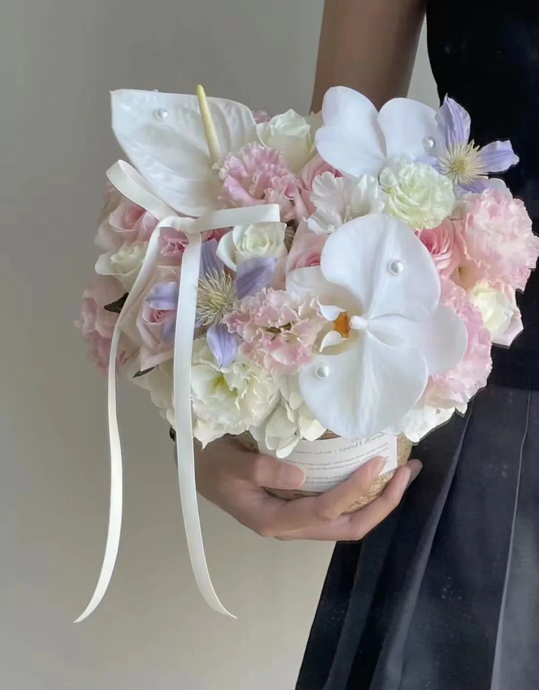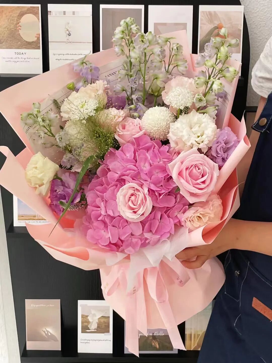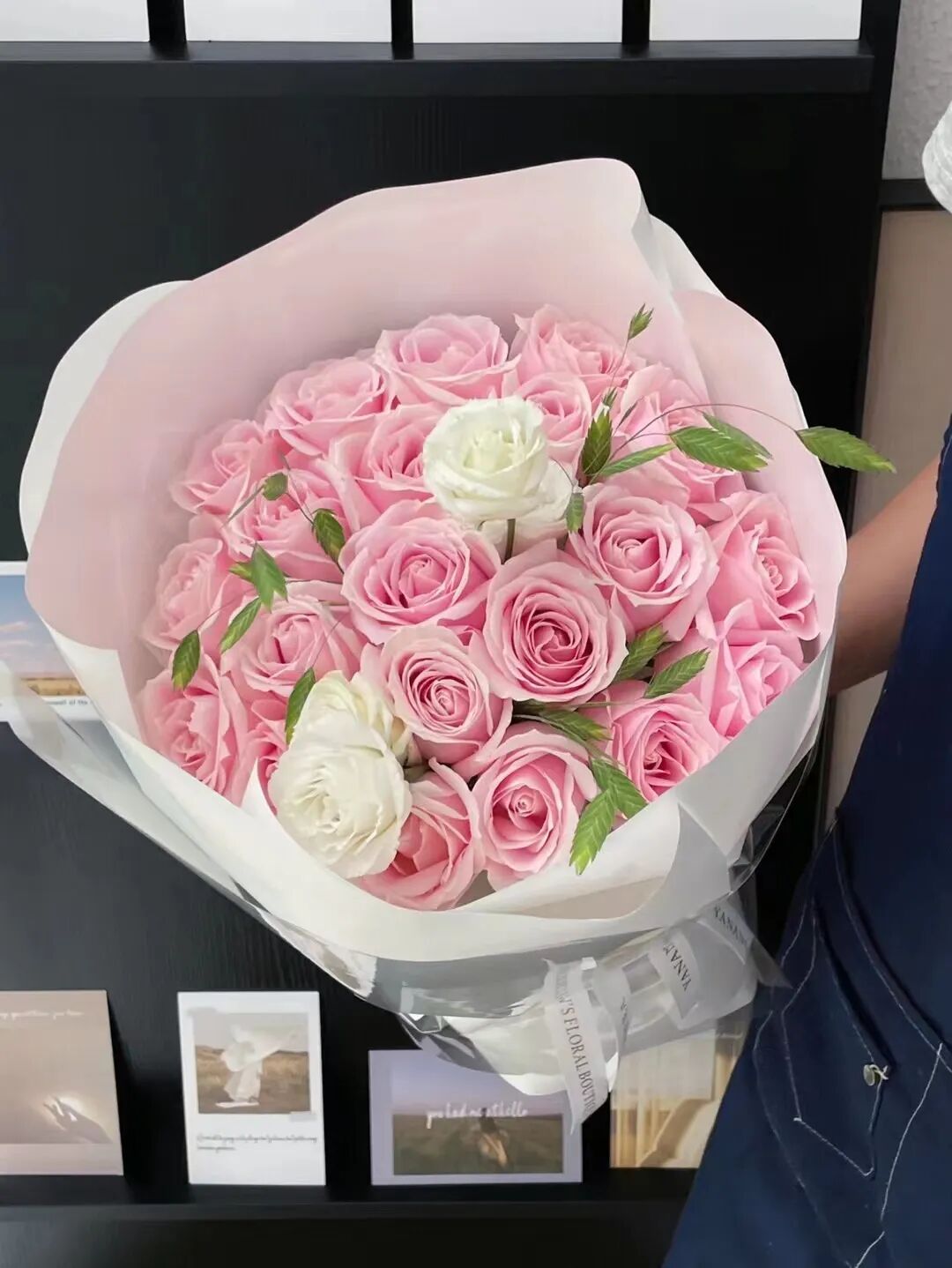 精美包装:选择精美的花束包装和礼品盒,增加花束的高贵和精致感。可以使用彩色丝带、纸质包装纸、蝴蝶结等元素进行装饰,衬托花朵的美丽。
