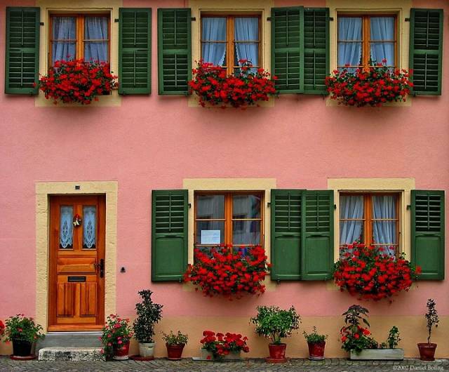 窗台悬挂的花盆,带给每户人家关于美和爱的概念……