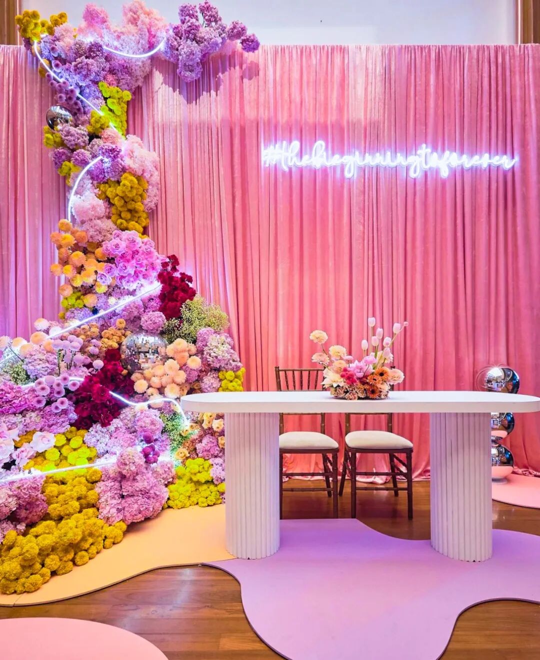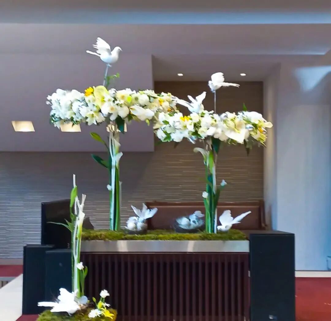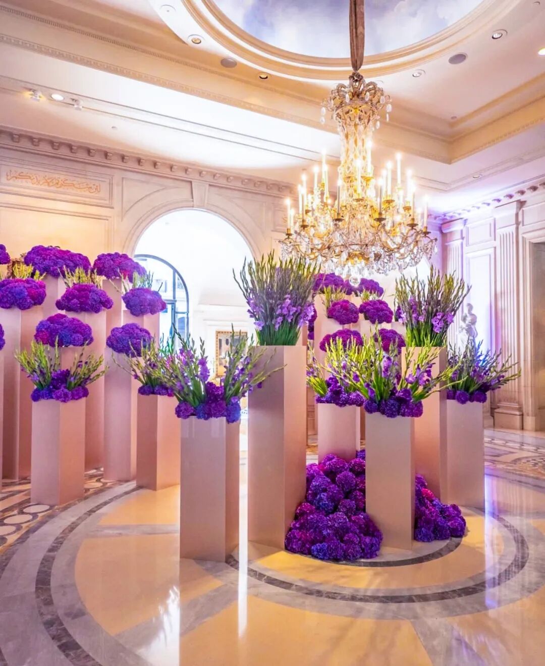 卧室是人们休息和放松的地方,软装花艺设计可以为卧室营造出宁静、舒适的氛围。设计师可以运用柔和的色彩和花材,打造出浪漫、温馨的卧室花艺。