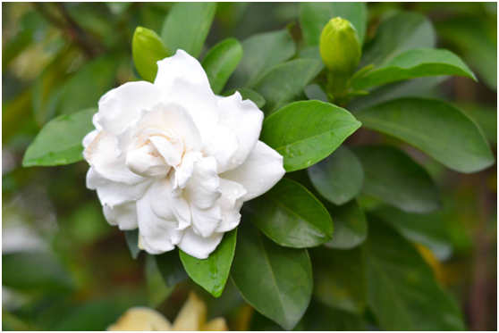 白色的大朵栀子花,藏在四季常绿的叶子间,素雅芳香,清新脱俗,栀子花的花语是坚强、永恒的爱、一生的守候。