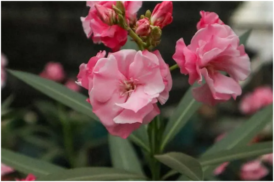 “夹竹桃”阿尔及利亚国树。常绿直立大灌木,高可达5米,枝条灰绿色,嫩枝条具棱,被微毛,老时毛脱落。