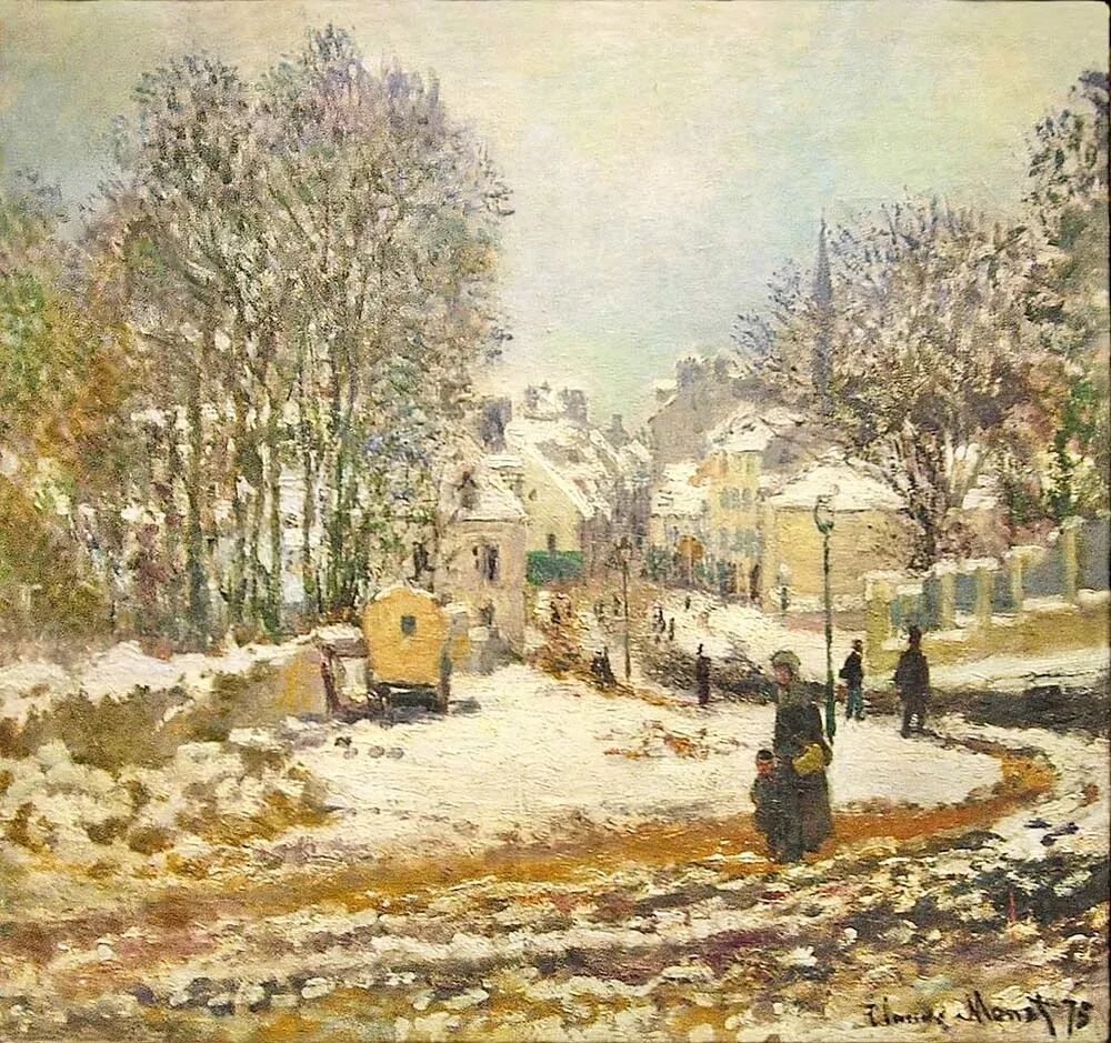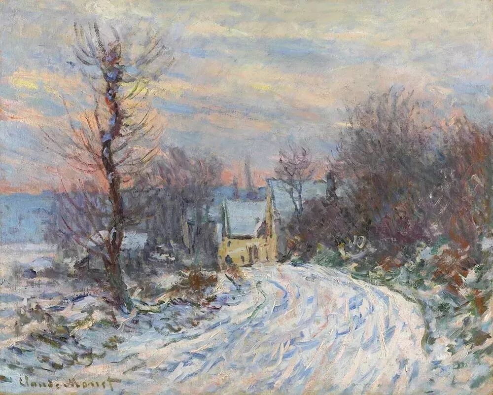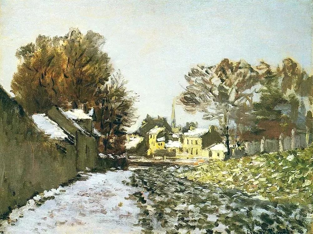 农村风景:莫奈经常选择描绘乡村冬天的风景,包括农田、小屋和农村道路。他通过这些画作表达了冬季田园的宁静和宜人之处。