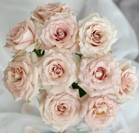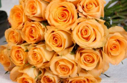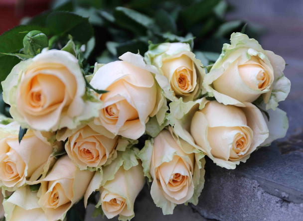 10、蜜桃雪山:香槟色,是以往老香槟(维西莉亚)替代品种,解决了以往老品种香槟玫瑰颜色不稳定,花头偏小的问题。蜜桃雪山玫瑰是一种非常美丽的玫瑰花品种,属于雪山玫瑰系列。它的颜色介于橙色和黄色之间,或是白色中透着黄色,饱和度低,带有一种淡淡的杏黄色。花语是“我只钟情你”,非常适合用来表达浓浓的爱意和深情。花期为10天左右,花瓣特别多,花头也特别大。养护时,需保留花头下3~5片叶,将刺和多余的叶片去除,并剪根处理。每天换水剪根,清洗花瓶和花茎,保持通风,避免暴晒。