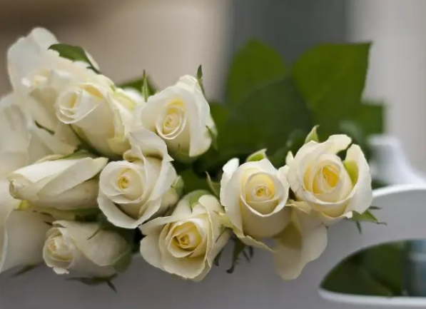 4.白玫瑰,是玫瑰花的一个品种,性喜阳光,较耐寒,耐旱,喜通风凉爽气候,在肥沃的中性或微酸性壤土中生长良好,开花多。白玫瑰是玫瑰花中的另一种经典品种,它的颜色纯洁、清新,给人一种优雅、高贵的感觉。白玫瑰的花语是纯洁、高贵、天真和尊敬,是一种非常适合表达纯洁、美好情感或者用于重要场合的鲜花。白玫瑰在日常生活中也被广泛用于婚礼、葬礼或者一些正式的场合,是一种非常有意义的鲜花。