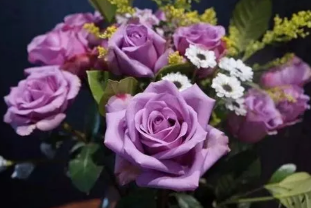 7.海洋之歌:紫色系玫瑰品种,由国外引进的种苗,与紫皇后相似,花瓣偏薄,容易产生压痕。海洋之歌玫瑰是一种非常美丽的紫色玫瑰,属于切花、杂交的茶月季。它的花朵娇小,花瓣倒卵形,重瓣至半重瓣,香气甜润,温养人心,紫色赋予它高贵的神秘感,灰冷的色调又给人距离感。海洋之歌是紫色系玫瑰中经典的一款,花朵比一般的玫瑰略小,花型端庄、颜色纯正,花色雅致,细闻有淡淡茶香。这种低饱和度的紫色,很容易与其他浅色系的花材搭配,单独插瓶颜值也很不错。海洋之歌的花语是永恒的爱情,适合送给心仪的人表达爱意和承诺。