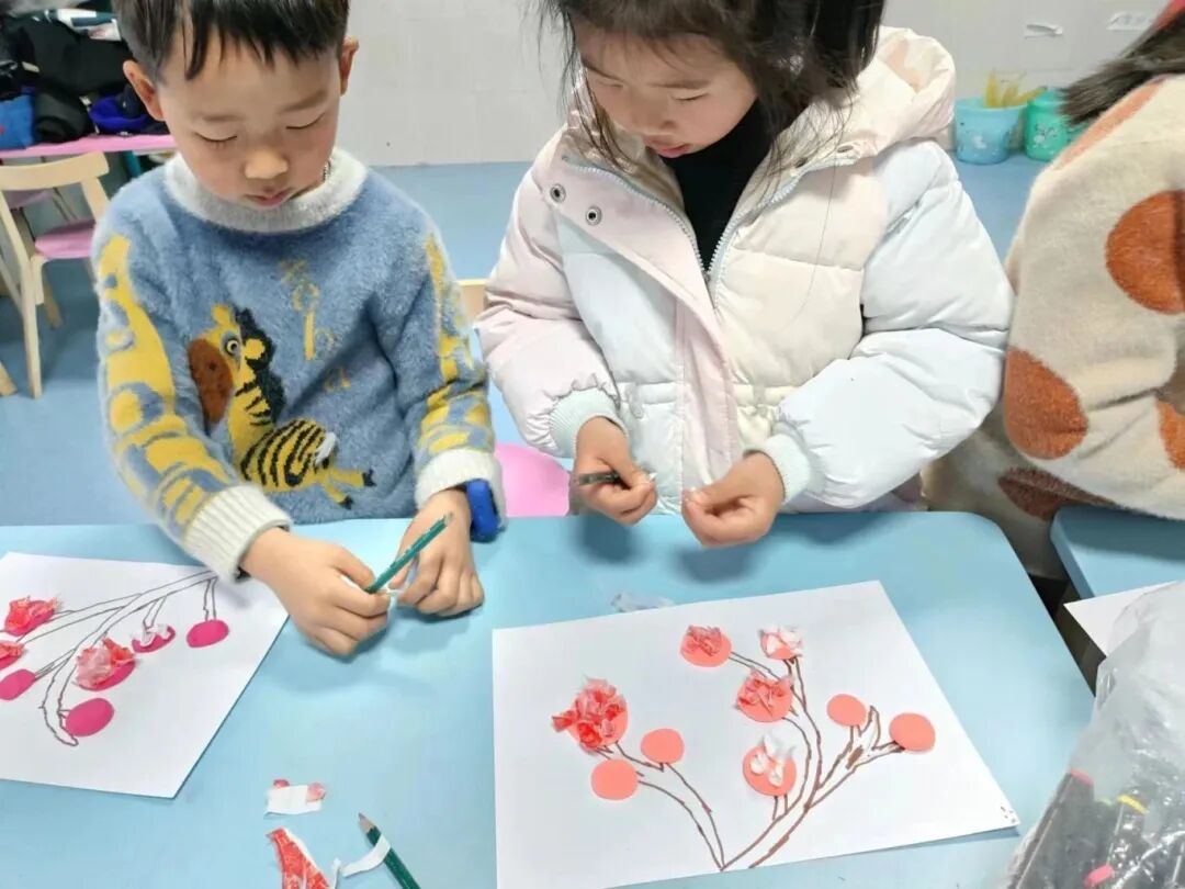 团安福县委在山庄乡秀水村童心港湾开展“流动青少年宫”暨“团团陪你过大年”主题活动,童伴妈妈和大学生志愿者组织孩子们猜灯谜,利用黏土、口罩等工具在纸上制作出一幅幅精美又富有个性的梅花画。