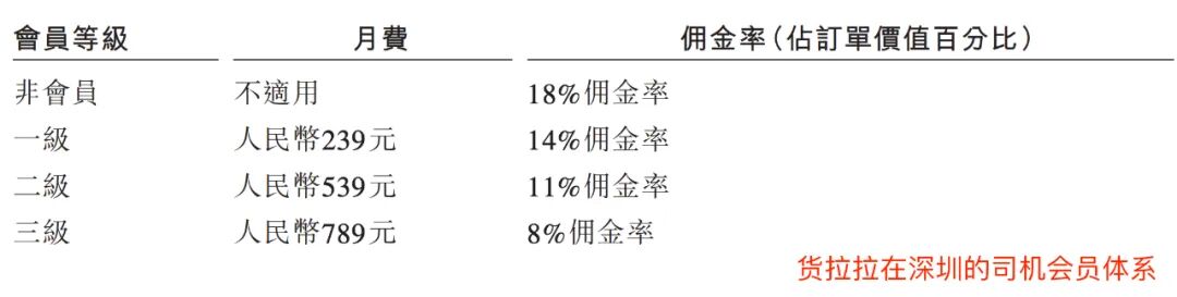 货拉拉在2016年推出会员制,不同级别的会员享有不同程度的折扣。招股书显示,以深圳若干车型的会员为例,一级、二级和三级会员费用分别为189元、489元和739元,享有的佣金折扣分别为14%、11%和8%。