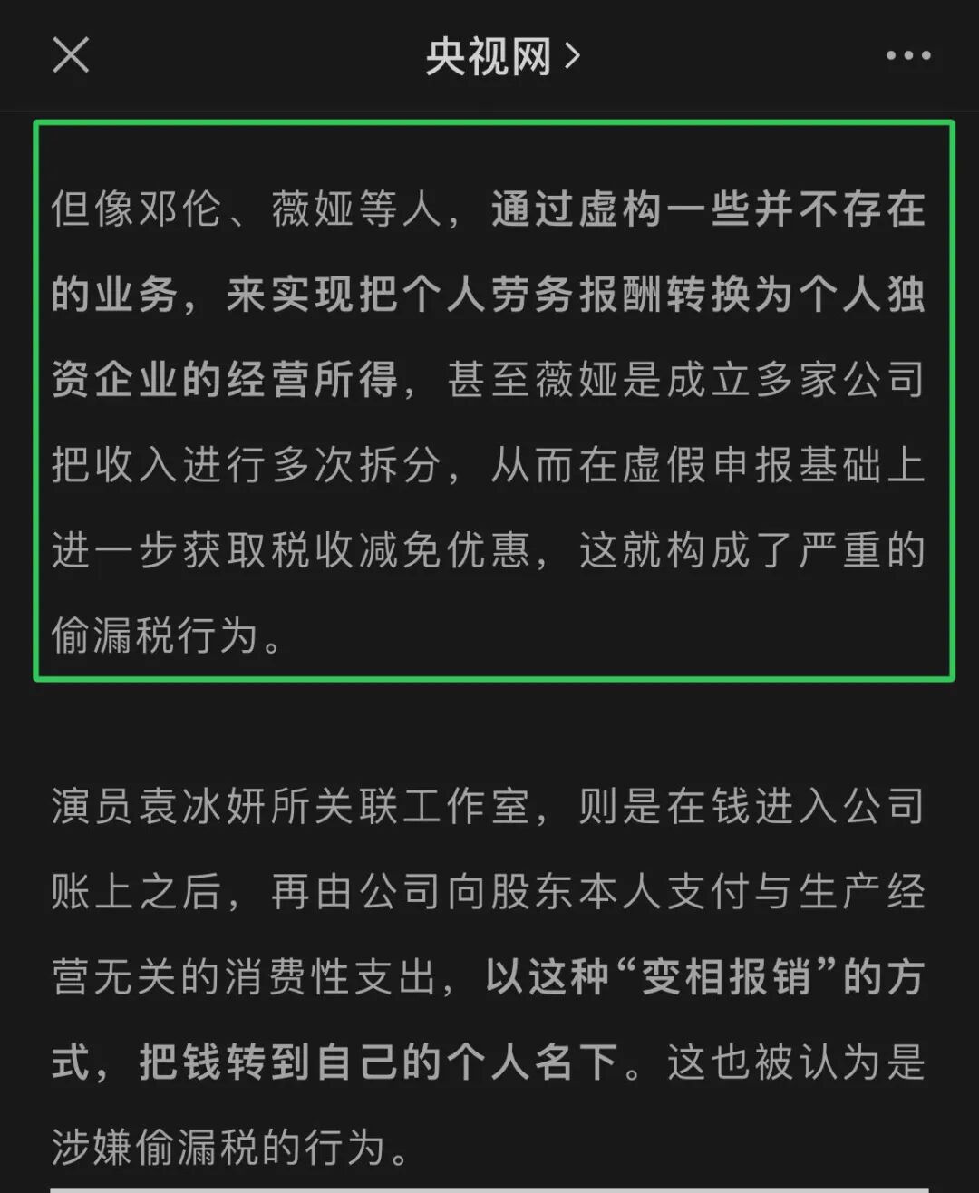 《央视网》9月7日发文揭露明星范冰冰、郑爽、邓伦等人逃漏税的手法,其中邓伦、薇娅等人,通过虚构一些并不存在的业务,来实现把个人劳务报酬转换为个人独资企业的经营所得,甚至薇娅成立多家公司把收入进行多次拆分,从而在虚假申报基础上进一步获取税收减免优惠,这就构成了严重的偷漏税行为。