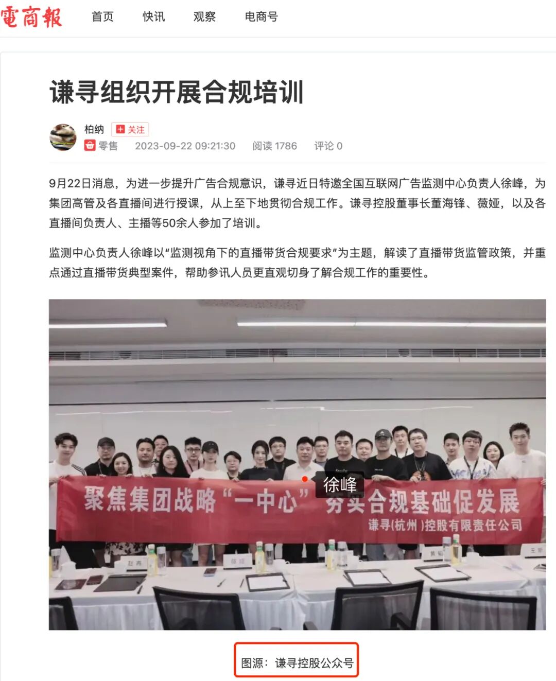 9月19日,谦寻控股邀请全国互联网广告监测中心负责人徐峰为该公司高管做“合规”方面的培训,谦寻控股董事长董海锋、薇娅参加。
