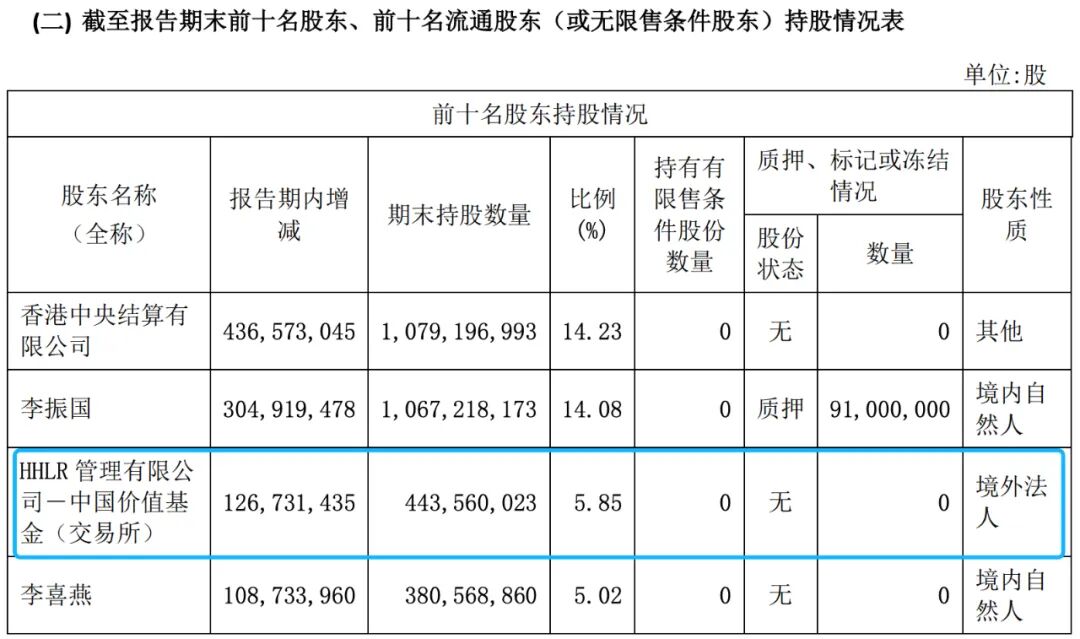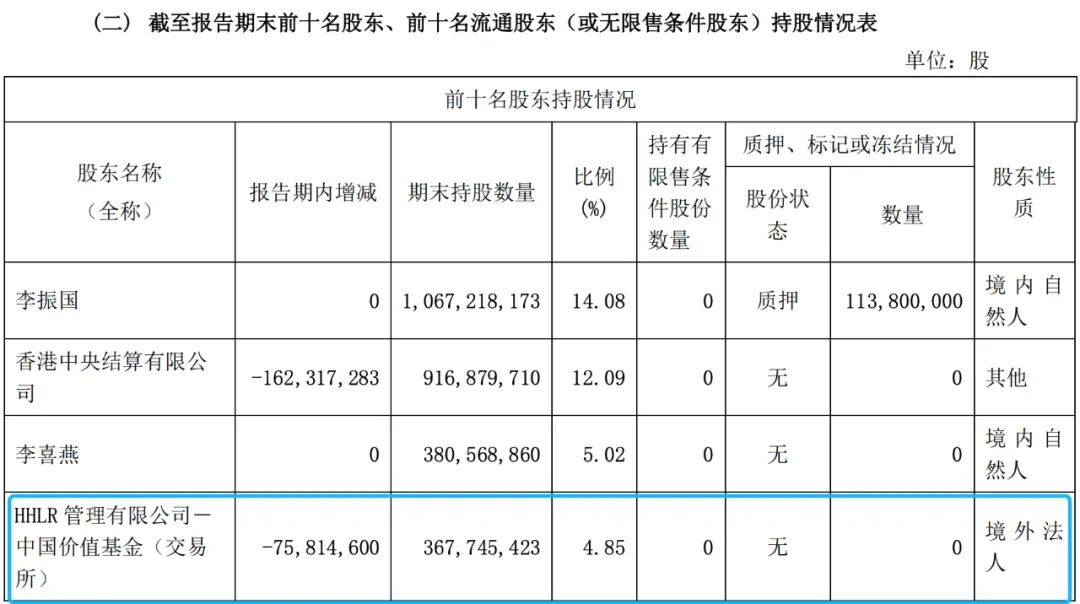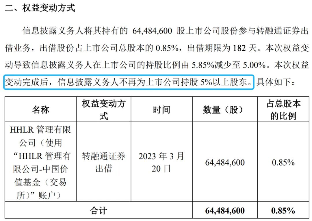 这个公告一经发布,就引起市场极大关注,因为在2022年年报中,HHLR的持股比例是5.85%,这刚过了九个月,0.87%的股份是怎么减少的?