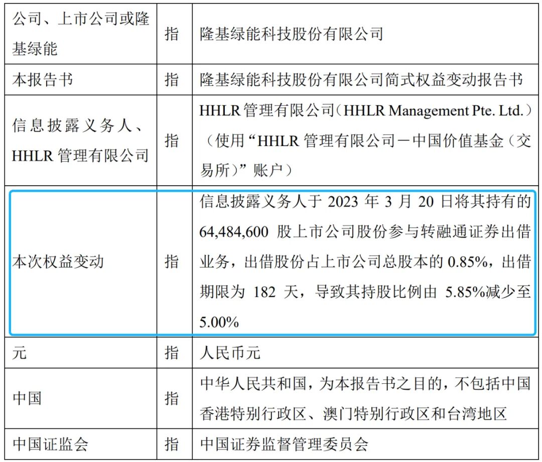今年3月21日,隆基绿能发布了的一则《简式权益变动报告书》显示,HHLR公司3月20日将其持有的64,484,600股上市公司股份参与转融通证券出借业务,出借股份占上市公司总股本的0.85%,出借期限为182天,导致其持股比例由5.85%减少至5.00%。