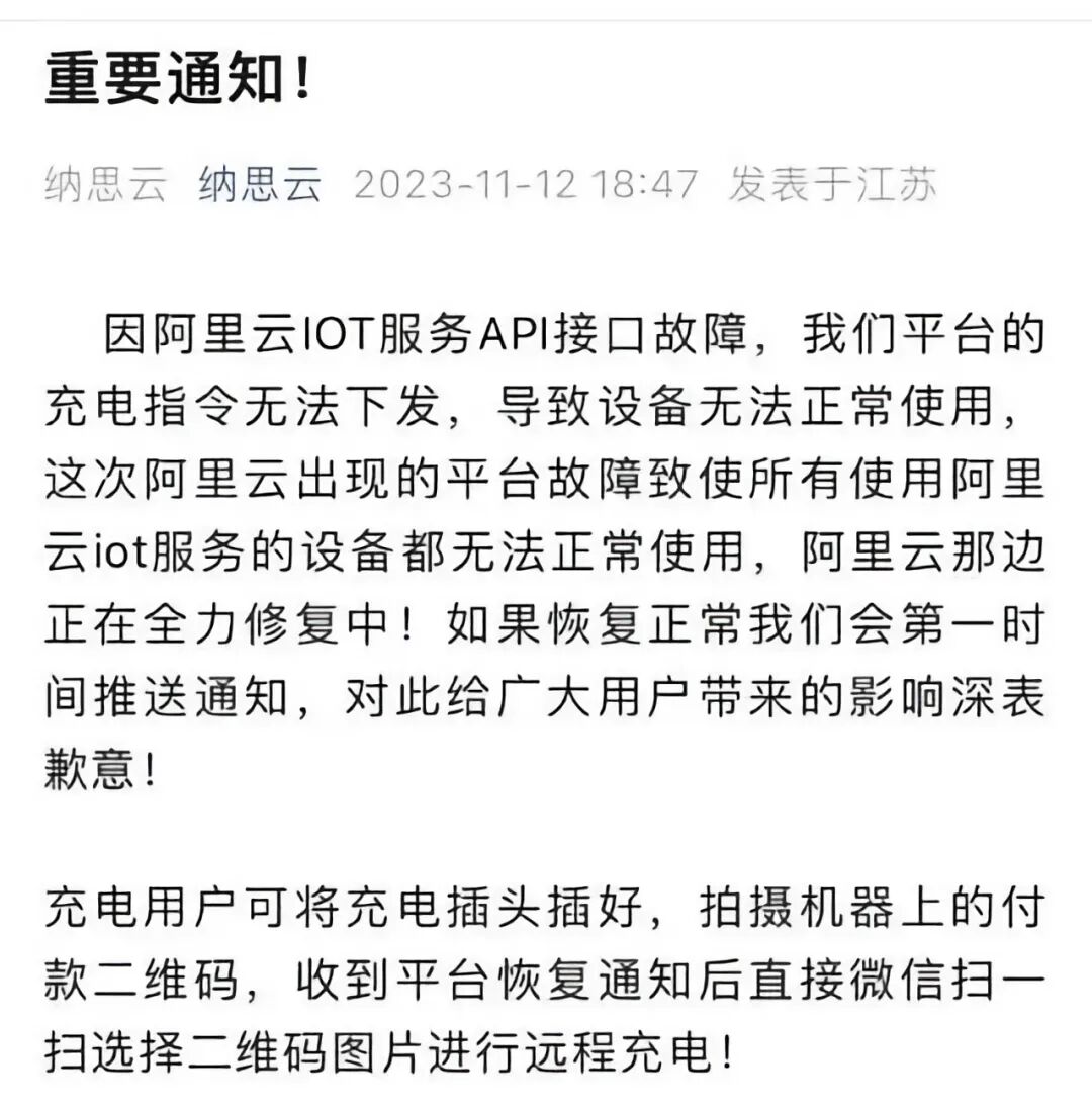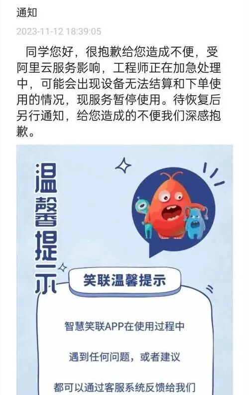 还有网友称,智慧笑联APP因为受到阿里云服务影响也不能使用。“就连充电桩和学校里的洗衣机、饮水机机器都‘崩’了。”