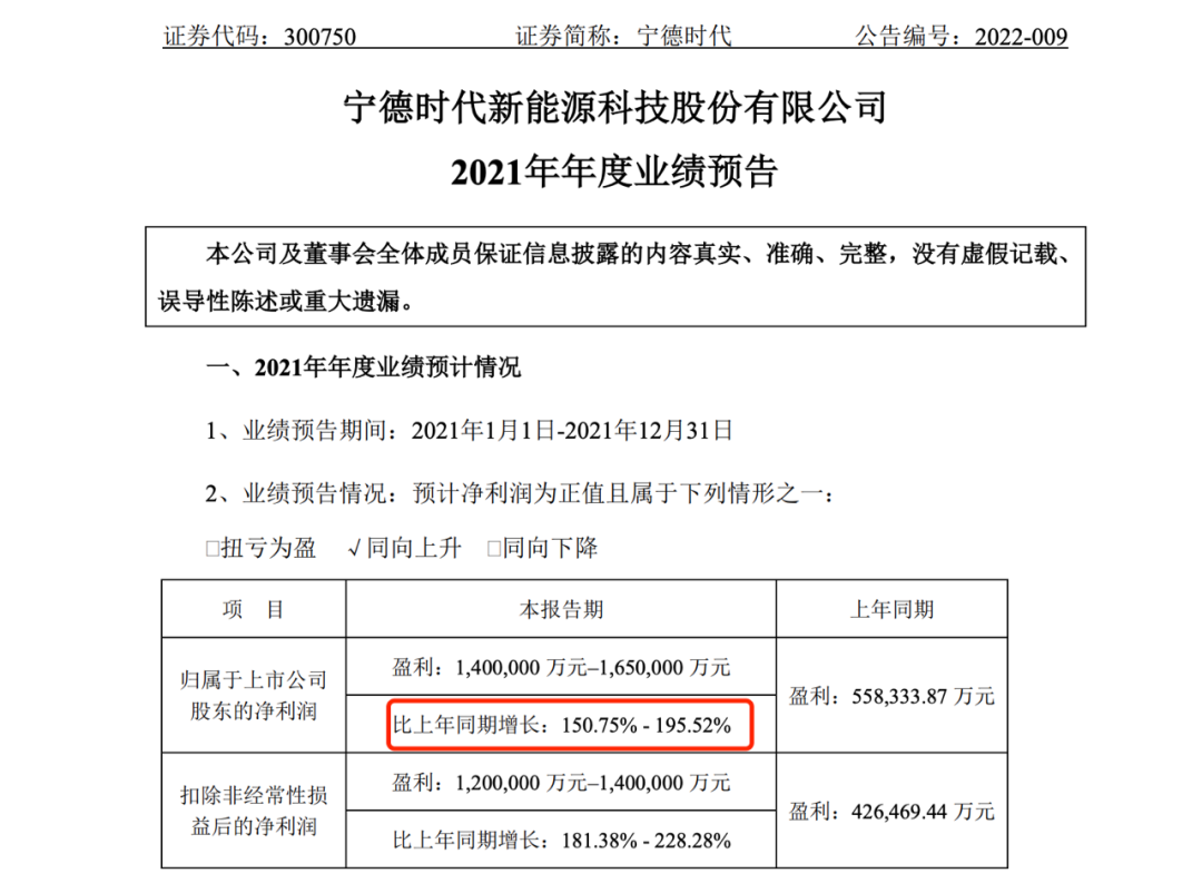 1月28日,春节前的最后一个交易日,宁德时代发布业绩预告,预计2021年归母净利润140-165亿元,同比增长150.75%-195.52%,远超市场预期。