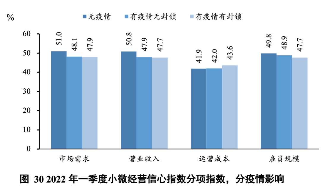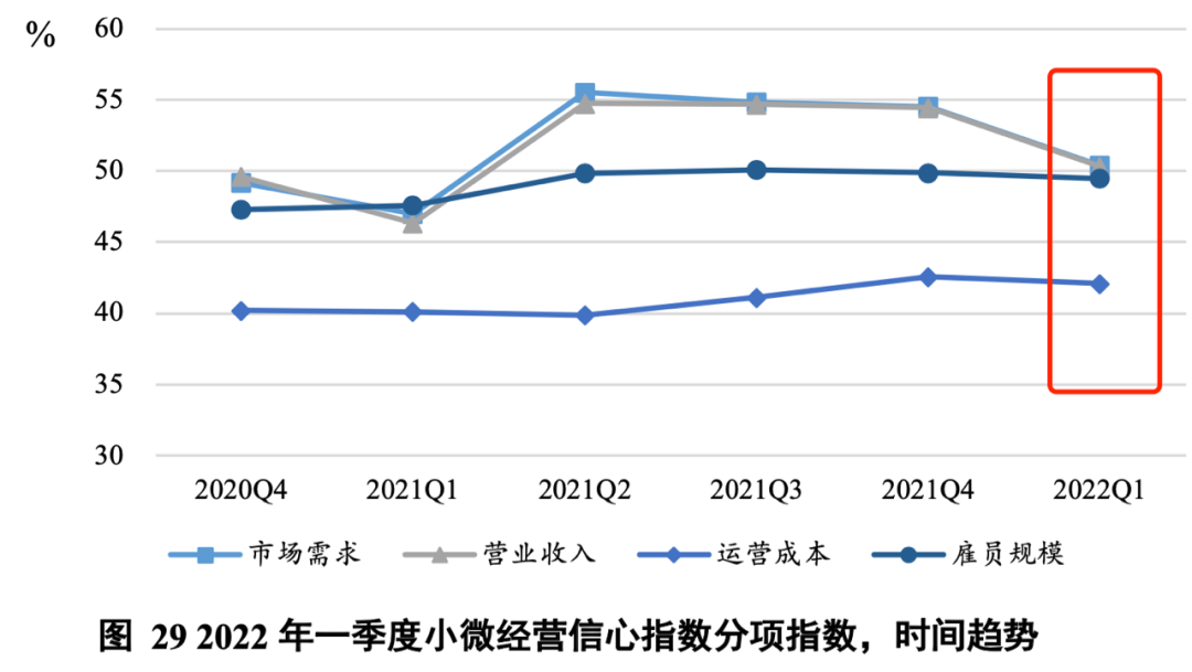值得警惕的是,《报告》显示,2022年一季度,小微经营者信心指数依然出现下滑,已经达到荣枯线以下。