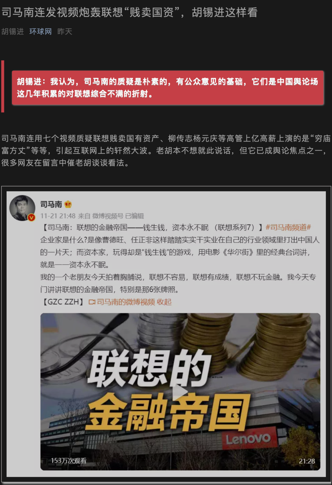 胡锡进在评论中说,司马南的质疑是朴素的,有公众意见的基础,它们是中国舆论场这几年积累的对联想综合不满的折射。联想曾是改革先锋,柳传志和杨元庆的表现从一定意义上说参与了对中国企业家的定义,社会给予了联想和柳杨极高的尊敬和期待,联想也等于是对国人做了当IT龙头企业、推动中国高新技术前进的承诺。