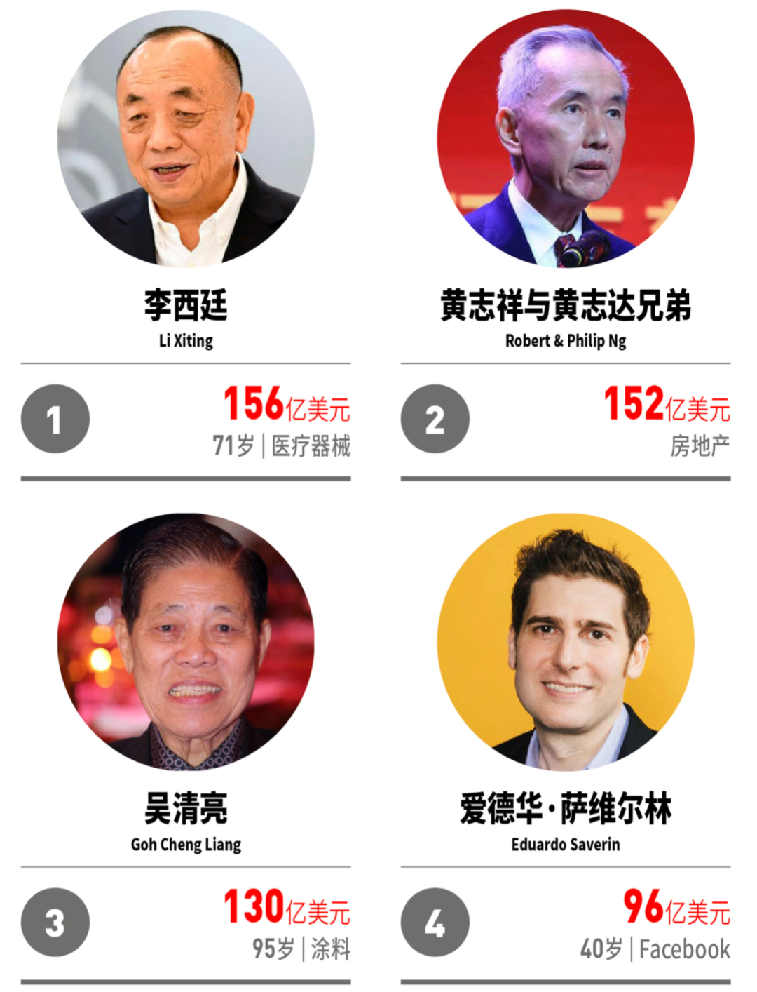 有意思的是,今年的榜单第二名、第三名都是华人,都是来自中国的移民富豪,远东机构黄志祥黄志达兄弟的财富为152亿美元;立时集团创始人、"油漆大王"吴清亮的财富为130亿美元。