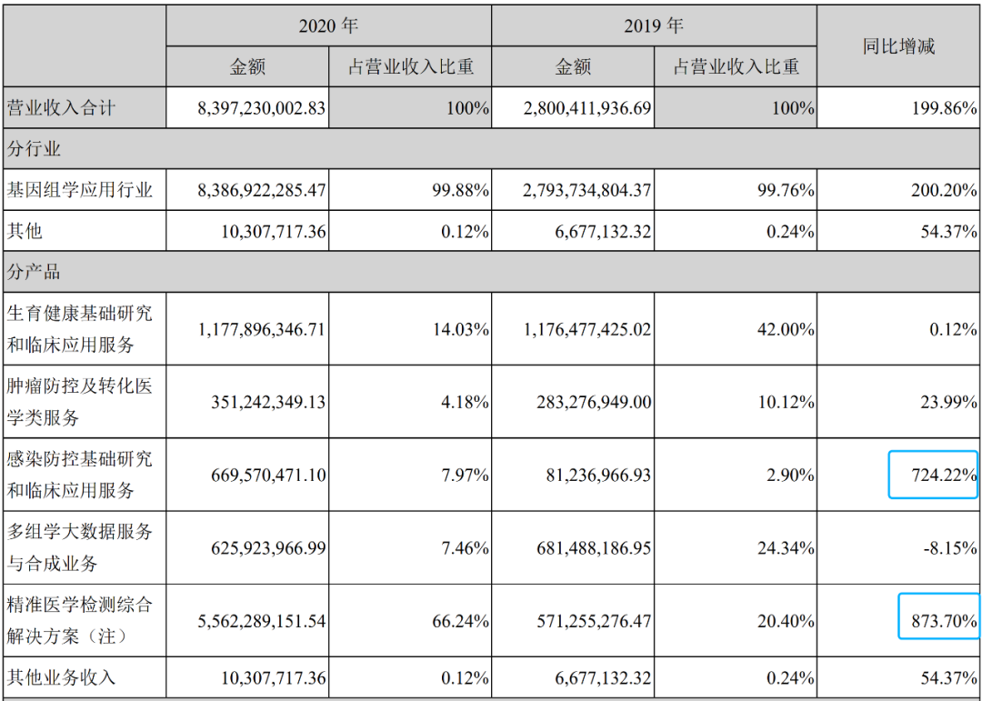 除了营收大涨,上述两大核酸检测相关业务营收比重也大幅上升,“服务一”的营收比重从2019年的2.9%上升到2020年的7.97%,2021年进一步上升到17.12%。“服务二”的营收比重从2019年的20.40%上升到2020年的66.24%,2021年下降至49.99%。