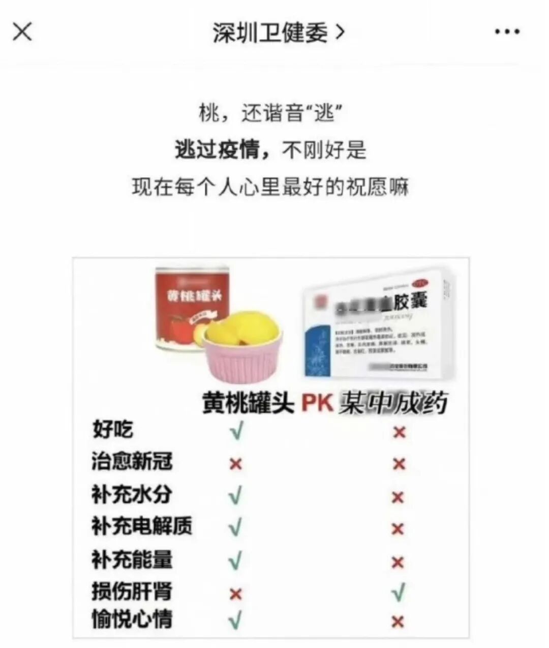 三是深圳卫健委说连花清瘟疗效不如黄桃罐头。