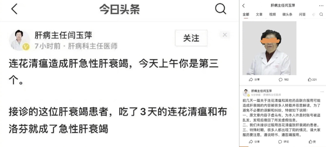 一是山东闫姓女大夫帐号发布“肝衰竭”谣言。