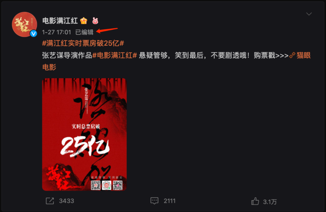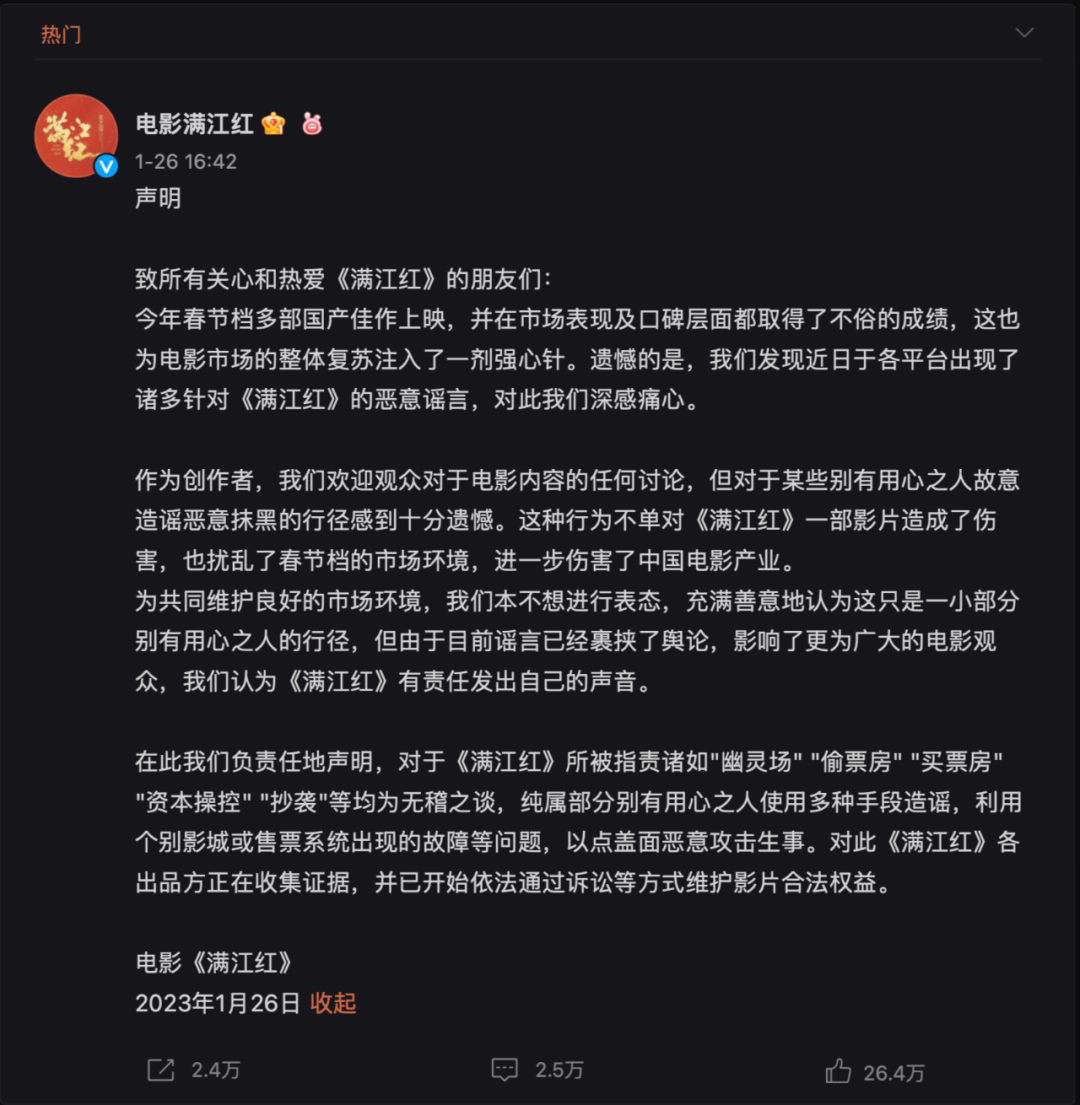 1月26日,《满江红》官微发文称,诸如“幽灵场”“偷票房”“买票房”“资本操控”“抄袭”等均为无稽之谈,纯属造谣。